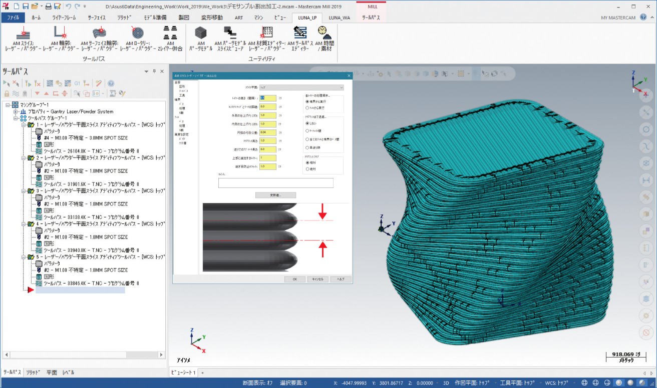 切削とは全く違ったプロセスを実現するには専用ロジックに基づく演算が必要です。LUNAは、積層プロセスに必須の多様なパラメータ設定が可能。積層専用エンジンによって各シーンに最適な積層パスを生成します。