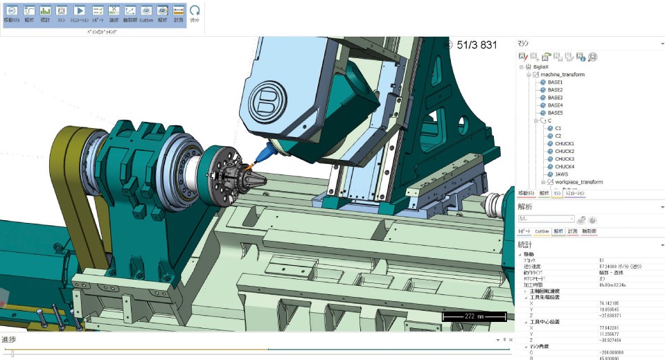 作成したツールパスを基に、画面上で工作機械の動作の確認や、ストック・ワーク・工具・ホルダー・機械構造物の干渉を検証し、問題のある箇所を効率よく見つけることができます。