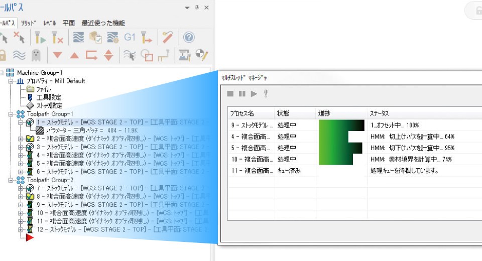 演算処理速度の高速化に対応。マルチスレッドはバックグラウンドモードでパスの計算終了を待たずに Mastercamの操作が並行して行えます。