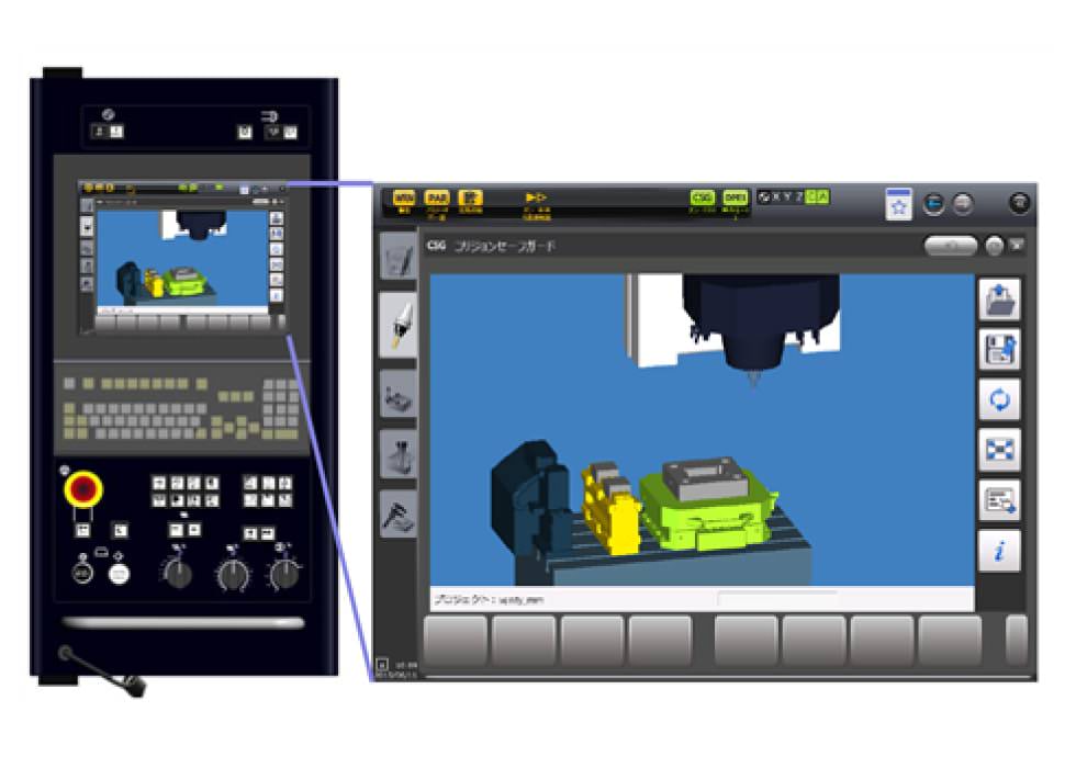 Mastercamから、ストック、設計、治具、工具データを取り出し、マキノコリジョンセーフガード用のデータを作成。このデータを機械に転送することにより、すぐさま動作確認することができる。